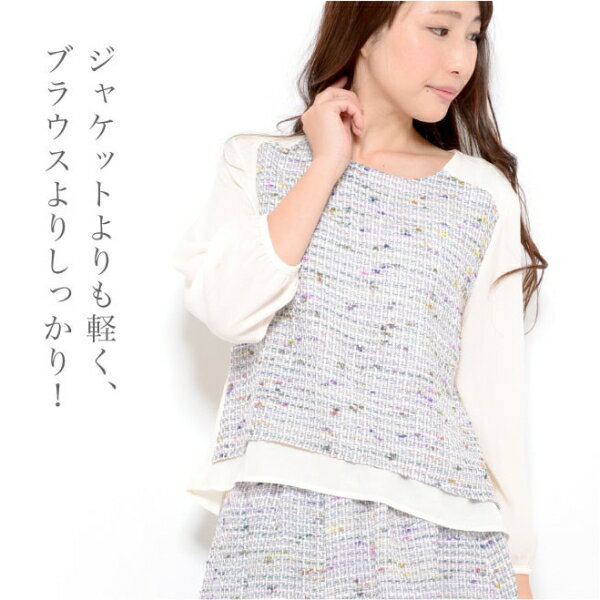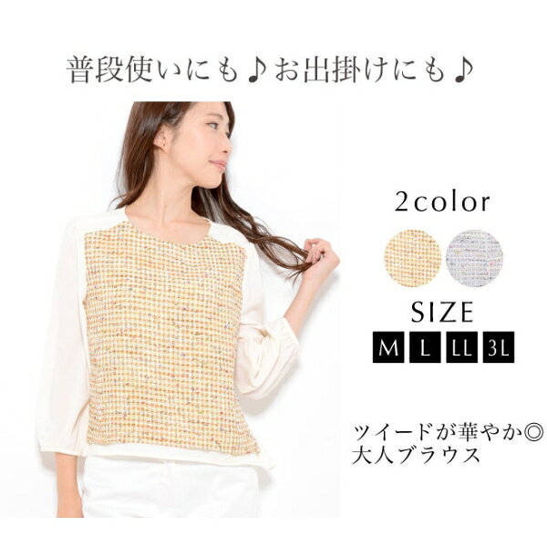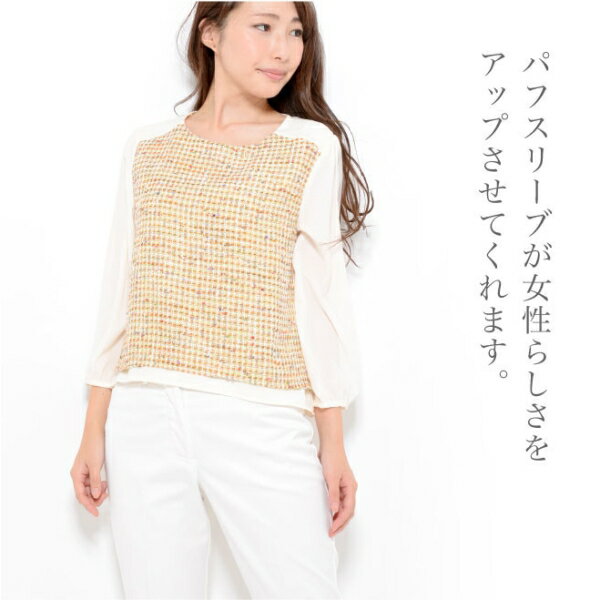 ブラウス M L LL 3L レディース トップス 長袖 ツイード シフォン パフスリーブ [キャンセル・変更・返品不可]